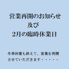 営業再開は2月10日(火)となります。何卒、宜しくお願い申し上げます。